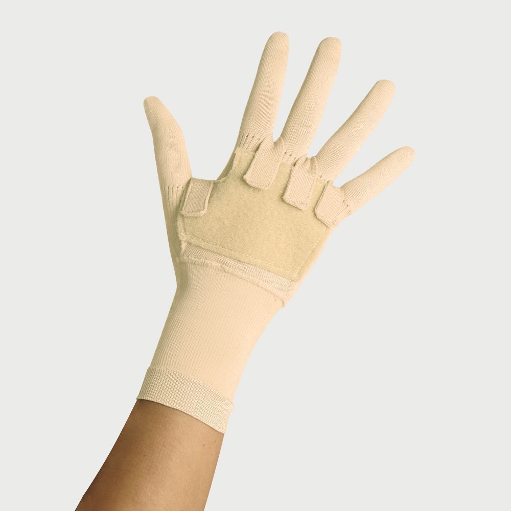 Hastanın ihtiyaçlarına ve ölçülerine göre yapılan dikişsiz dokuma ısmarlama eldiven.